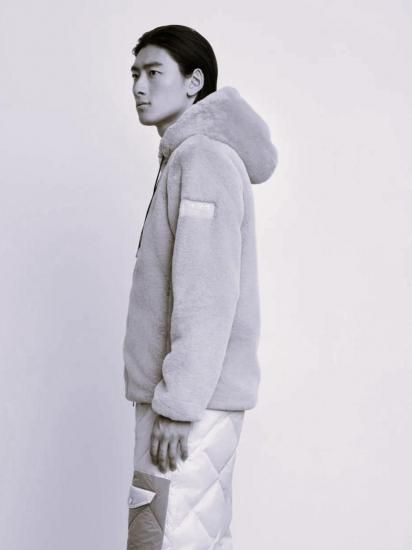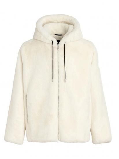 美しい艶感を持つ、エコファー素材を採用したフード付きブルゾン。