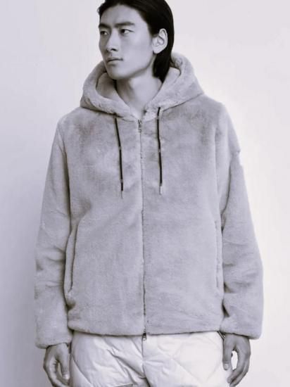 美しい艶感を持つ、エコファー素材を採用したフード付きブルゾン。